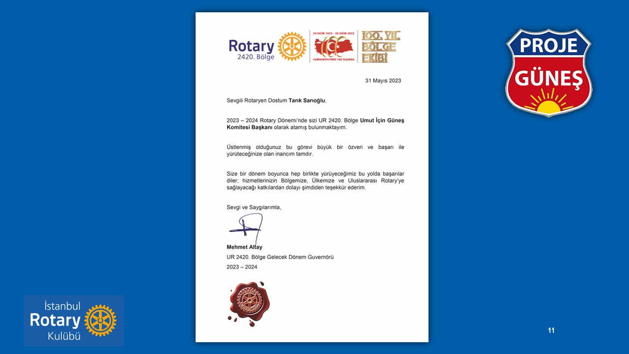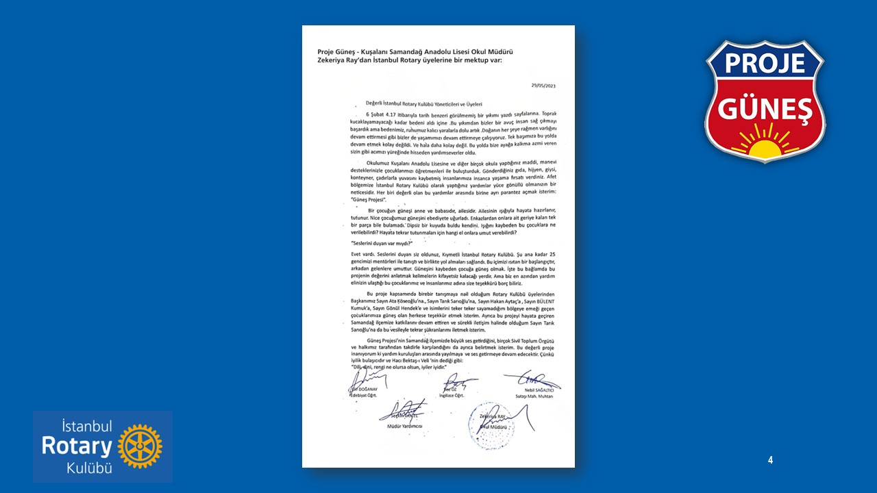 Güneş projesinin temeli 6 Şubat depremi ile beraber İstanbul Rotary üyeleri Tarık Sarıoğlu, Hakan Aytaç ve de İstanbul Rotay Kulübü Geçmiş Dönem Başkanı Ata Köseoğlu ile beraber Antakya'ya seyahatleri yaptığımız sırada atılmıştır.