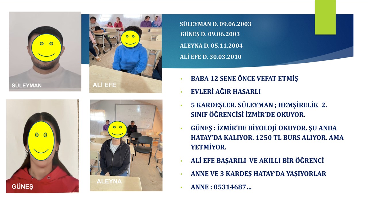 6 Ocak 2024 tarihinde yaptığımız Antakya ziyaretimizde, bizleri okullarında bekleyip güneşlerini arayan 150 kadar öğrencimizin vasileriyle orada olduklarını gördük.