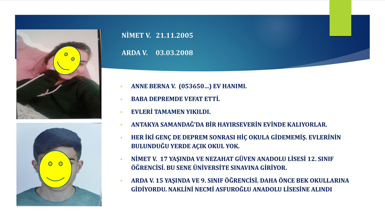 İlk olarak liseye giden çocuklarımızın bir yıl kaybetmemeleri. üniversite hayatlarından kopmamaları için önceliğimizi bu çocuklara vermemiz gerektiğini düşündük ve yardım yapmış olduğumuz okullardaki hocalarımızın da katkısıyla bu çocuklarla önce yüz yüze, sonra da vasileri ile beraber görüşmeler yaptık.